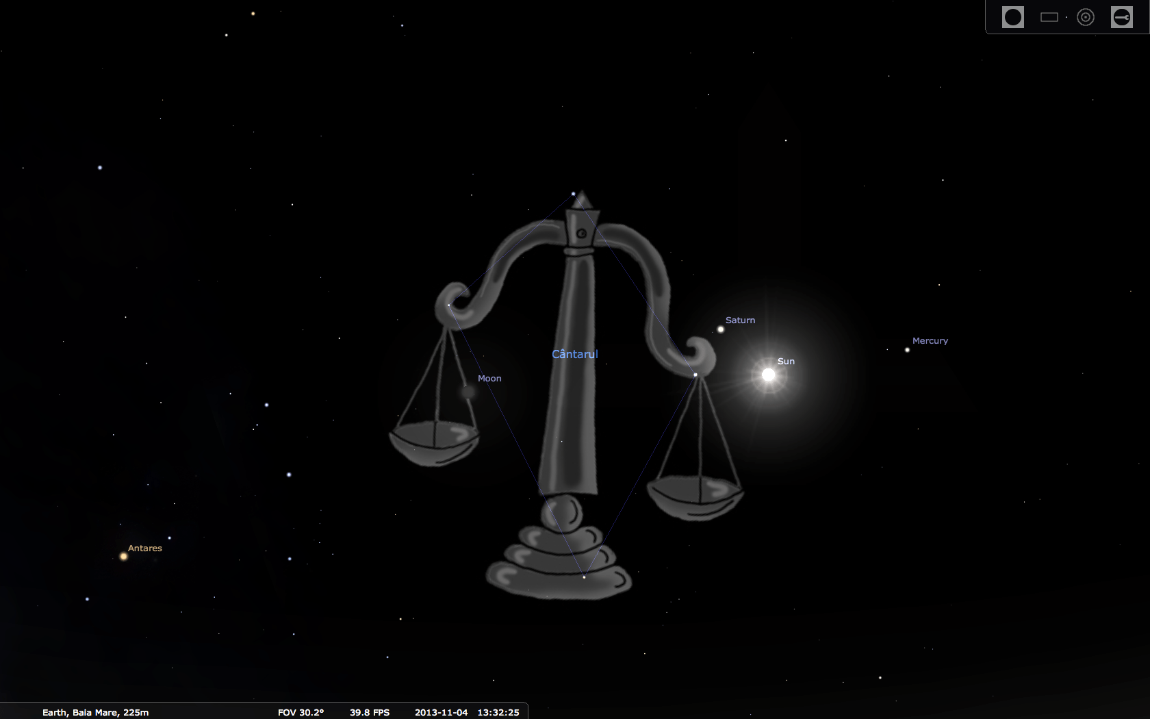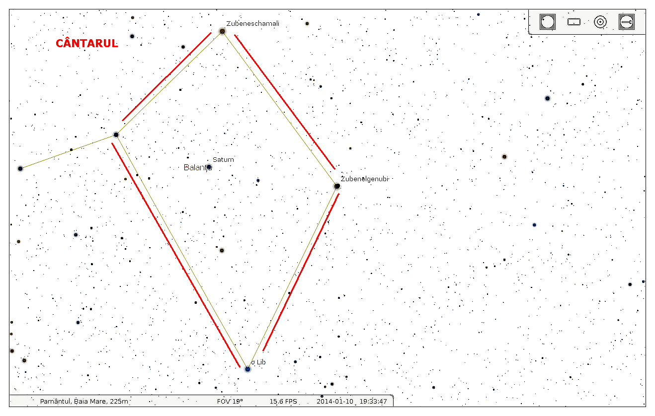 Libra is an ecliptic constellation of weak bright stars, a configuration difficult to recognize even in the June nights sky, when the constellation is at the superior climax. It has common borders with the constellations Virgo, Ophiuchus, Scorpius, Lupus, Centaur and Hydra. The main stars of the constellation are Zubeneschamali and Zubenelgenubi, who once represented the northern and southern claws of Scorpius. When and how did them become component stars of the constellation Balance can not be predicted with certainty. In the Romanian tales about the sky and stars, Libra represent actually the scales used by Christ to weigh the facts of the people at the „doomsday”.