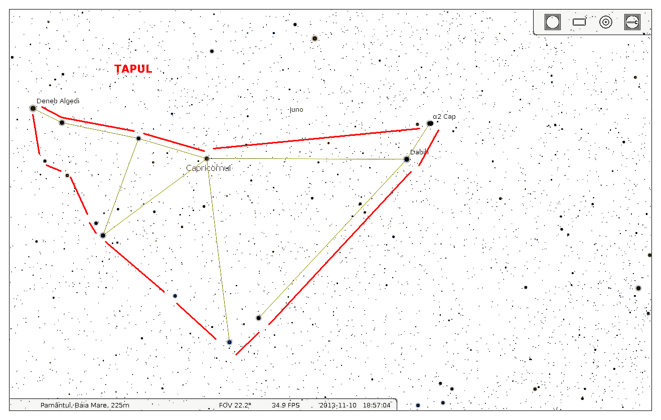 Capricornus is an ecliptic constellation identified by Ptolemy, with optimal visibility at this latitude in the autumn. It is bordered by the constellations Sagittarius, Aquila, Aquarium and Piscis Austrinus. The brightest star of the constellation is δ Capricornus, Deneb Algedi. Capricorn is a mythological creature half goat, half fish, in which god Pan has been metamorphosed to escape the giant Typhon. In Romanian mythology, the constellation is called He-goat or Goat’s horn. In the Romanian peasant imagination when it lightens in the Goat’s horn, rainy weather will surely follow.