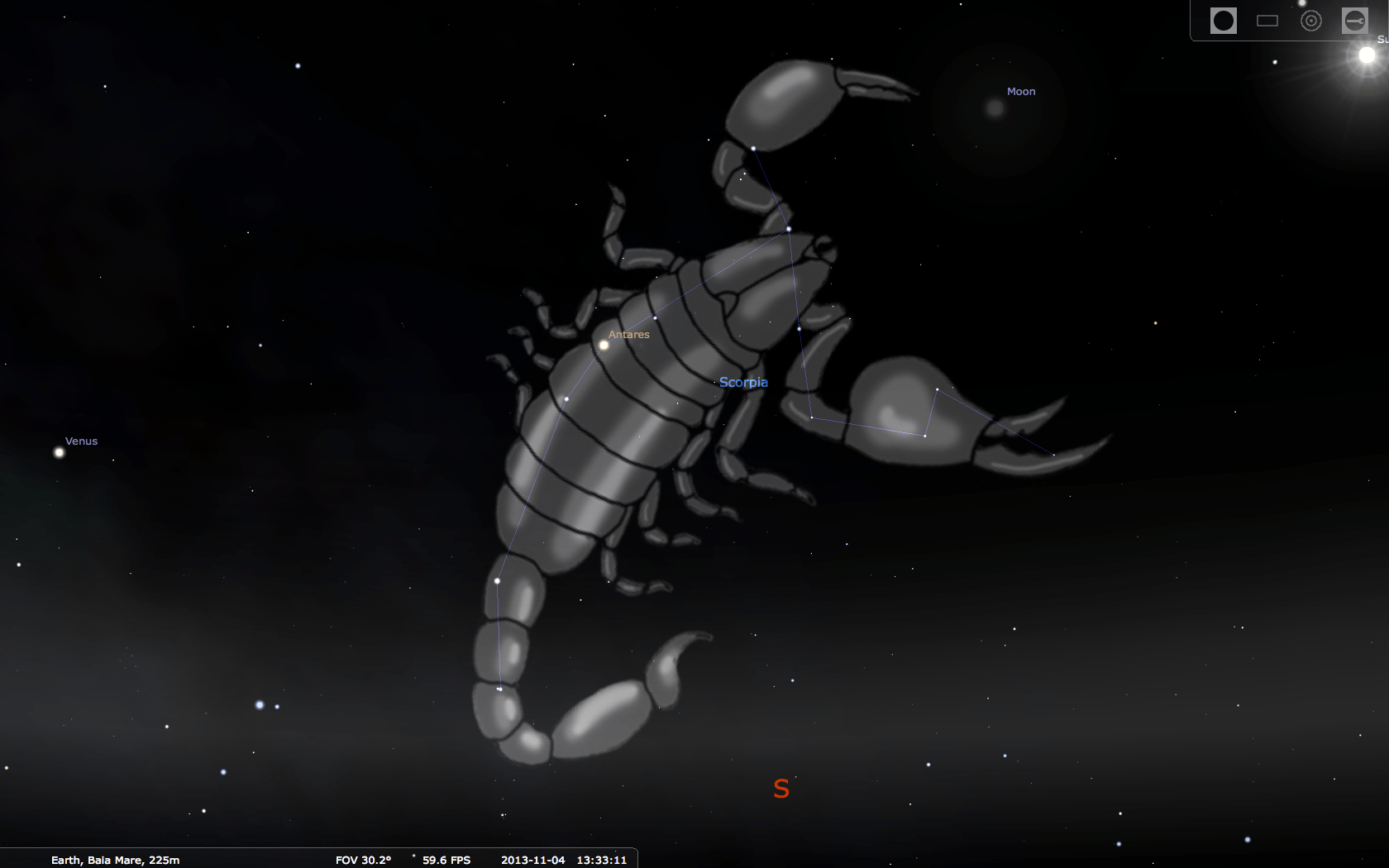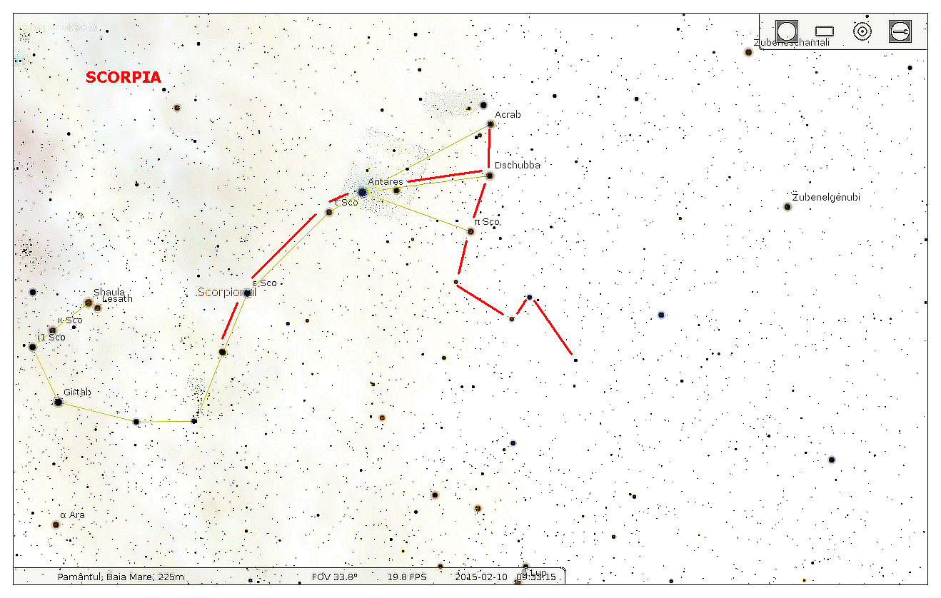Scorpius is an ecliptic constellation with optimal visibility at this latitude in July. It is bordered by the constellations Ara, Norma, Lupus, Libra, Ophiuchus and Sagittarius. The brightest star of the constellation is Antares, a red giant with a diameter of more than 800 times larger than the Sun. Scorpius was put on sky by people living in warmer area, where the animal is well-known and where this constellation climbs higher in the sky. For the peasants of Romania, who did not know much about this animal, the constellation has been likened to a witch, a monster with claws, bloodthirsty, which was thrown by the devil in front of the bold man who attempt to reach God.